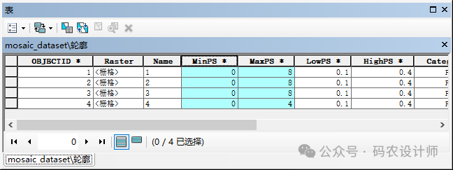 在内容列表窗口右击镶嵌数据集图层,选择【打开→属性表】,打开属性表即可查看 MinPS 和 MaxPS的值。根据【比例 = 像元大小 * 96 / 0.0254】的计算公式,当MaxPS=4时,显示图像的最大比例为4 * 96 / 0.0254≈15,118.1。因此在1:15,119比例下不会显示栅格数据。