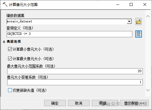 计算最小像元大小 (可选):是否计算镶嵌数据集中每个选定栅格数据集的最小像素大小。