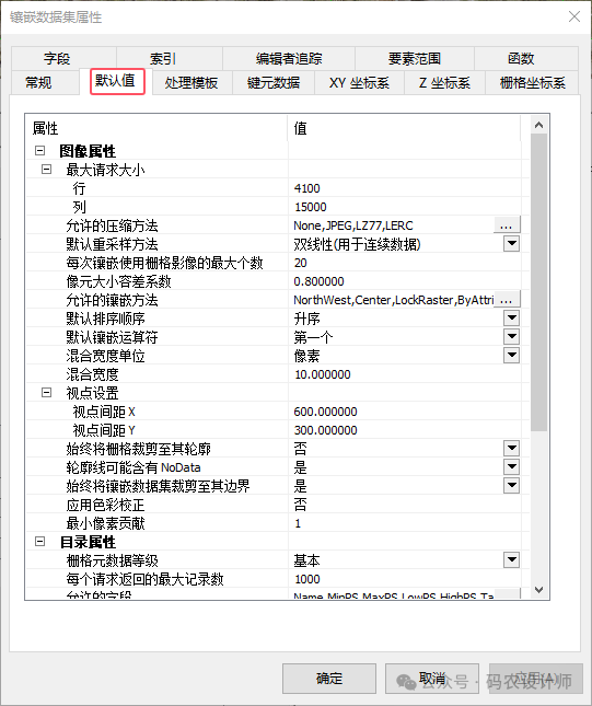 设置镶嵌数据集属性工具用于用于修改和配置镶嵌数据集的各种属性(包括图像属性、镶嵌属性、目录项属性)。