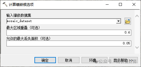 建议在运行【构建接缝线】或【平衡镶嵌数据集色彩】工具之前使用计算镶嵌候选项。输入镶嵌数据集轮廓线表格中的 Candidate 新字段将确定在这些操作中要使用的影像。