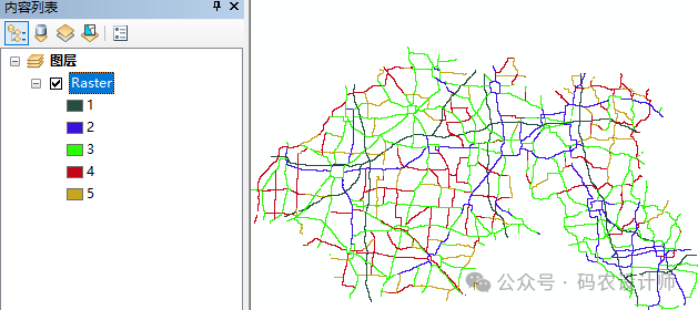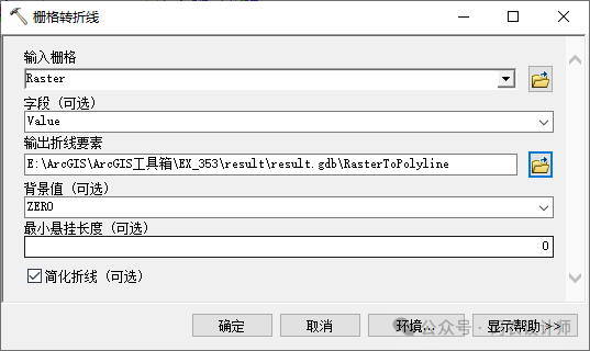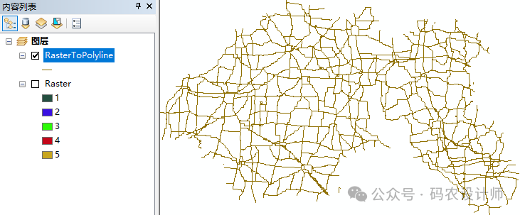 栅格转折线工具用于将栅格数据集转换为折线要素。适用于从栅格数据(如DEM、分类栅格等)中提取等高线、道路网络、水系等线性要素。