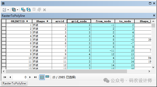设置完成,点击确定,得到输出的线要素。线要素属性表中的grid_code字段存储了输入栅格中每个像元的值(在工具中指定的字段参数)。from_node 和 to_node这两个字段用于表示折线的起点和终点,在输出属性表中标识了每条折线的起始节点和结束节点,可以帮助用户更好地理解和分析折线的拓扑结构。