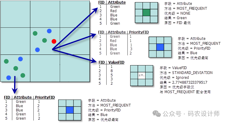 该工具提供了多种像元分配值的方法,用于确定当多个要素落在一个像元中时如何为像元分配值: