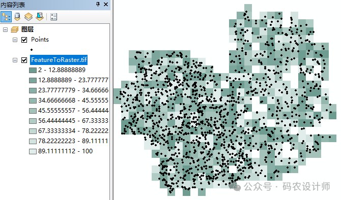 要素转栅格工具用于将要素转换为栅格数据集。任何包含点、线或面要素的要素类(地理数据库、shapefile 或 coverage)都可以转换为栅格数据集。