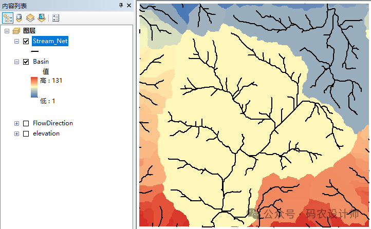 在盆域分析结果之上叠加之前通过栅格河网矢量化工具生成的河网数据【Stream_Net】,可以更直观的理解盆域的划分依据。