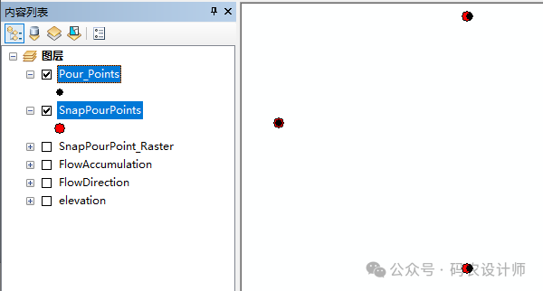 加载流量栅格数据【elevation】以及倾泻点数据【Pour_Points】。