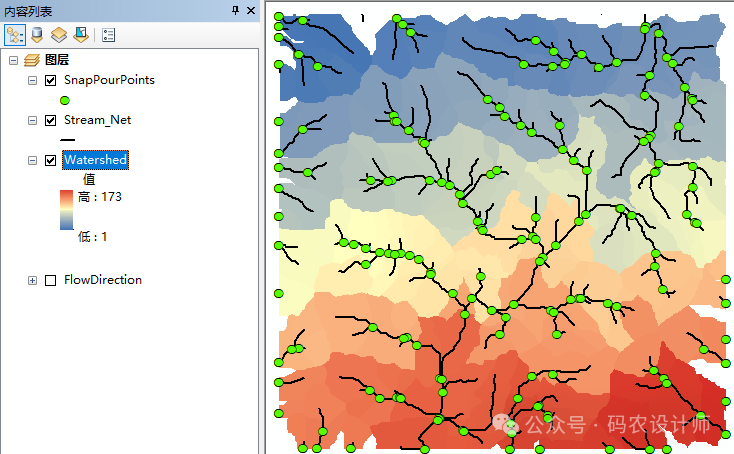具体来说,根据出水口(即该集水区的最低点),结合水流方向数据分析搜索出该出水点上游所有流过该出水口的栅格,直到所有的集水区的栅格都确定了位置,就搜索到了流域的边界,也就是分水岭的位置。