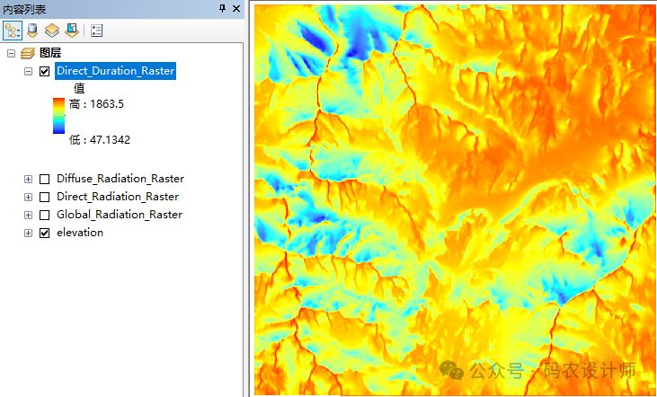 • Direct_Duration_Raster表示直入射太阳辐射的持续时间的输出栅格输出单位为小时