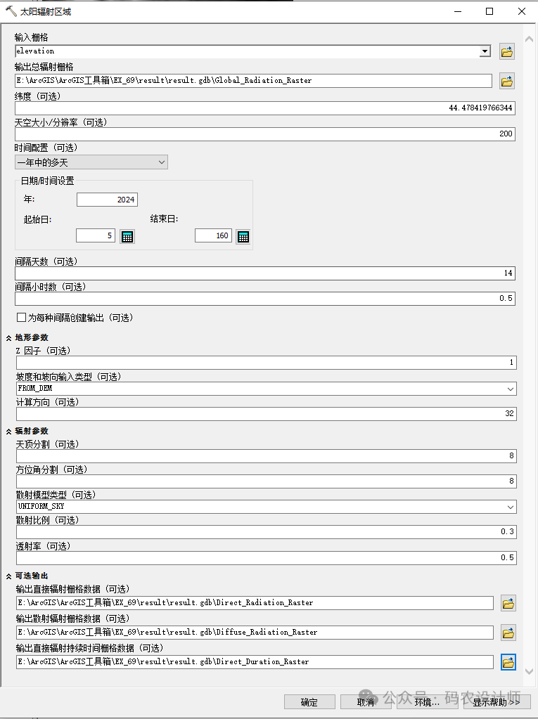 太阳辐射区域工具用于计算和分析整个地理区域内太阳辐射分布情况。该工具基于数字高程模型DEM数据建议数据采用投影坐标系统,即单位为,通过模拟太阳在天空中的运动轨迹和地表的地形特征,来估算每个位置在特定时间段内接收到的太阳辐射量。