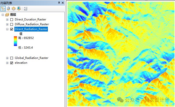 • Direct_Radiation_Raster:表示每个位置的直入射的太阳辐射的输出栅格,输出单位为瓦特小时每平方米 (WH/m2)