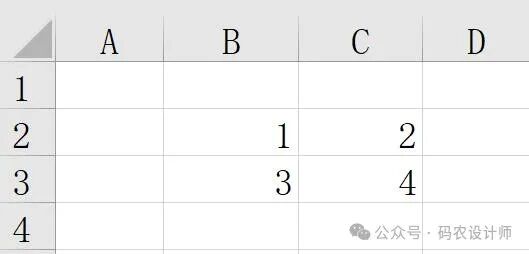 # 其中,1 会被写入 B2 单元格,2 写入 C2 单元格,3 写入 B3 单元格,4 写入 C3 单元格