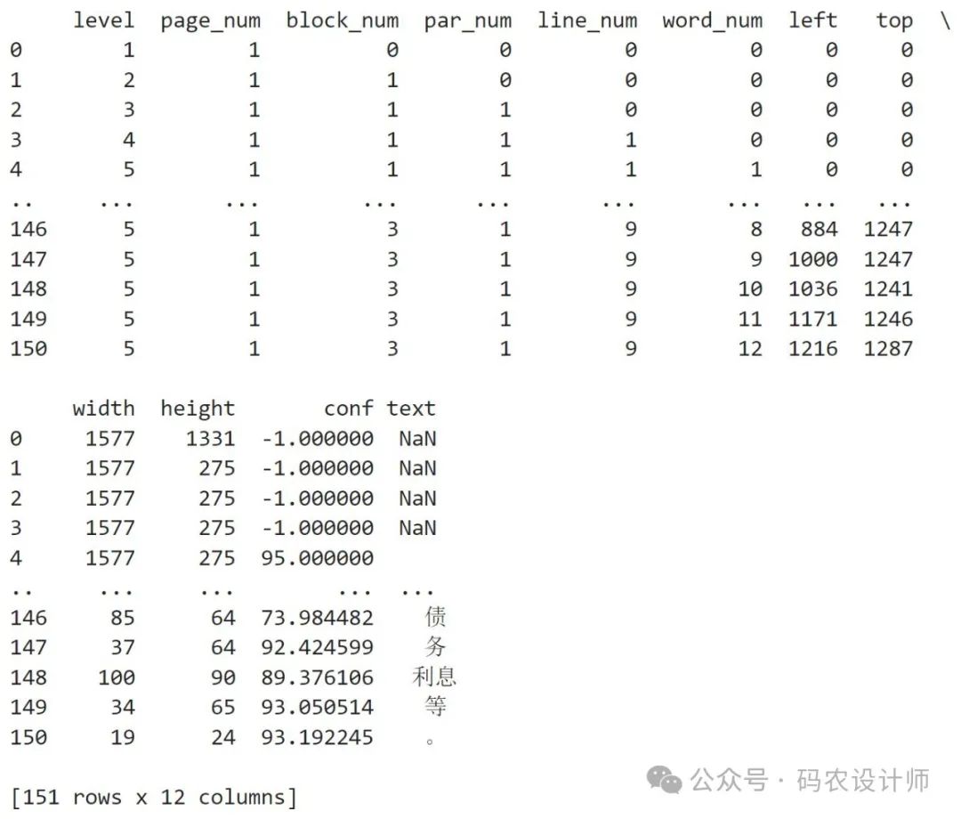 image_to_data()函数提供了更详细的输出,包括每个识别到的文字的坐标位置、置信度等信息,其基本语法如下: