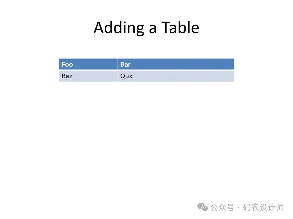 add_table()方法用于在幻灯片上添加表格。该方法接受表格的行数、列数、左偏移量、上偏移量、宽度和高度作为参数。该方法返回的是一个包含表格的形状对象,通过 .table 属性可以获取实际的表格对象。