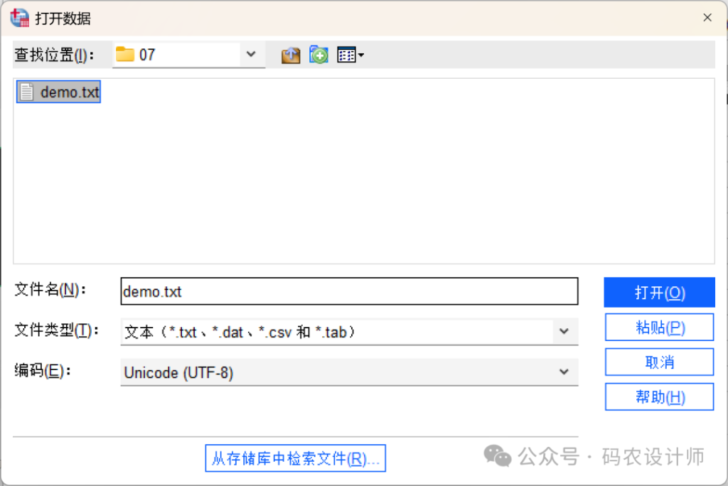 • 菜单操作:点击顶部菜单栏 【文件→打开→数据】(在「文件类型」下拉框中选择文本格式)或者【文件→导入数据→文本数据】,在弹出窗口中,选择文本文件(支持.txt、.csv、.dat、.tab格式)。