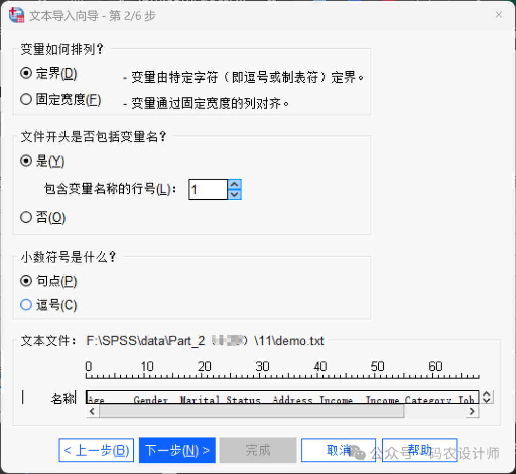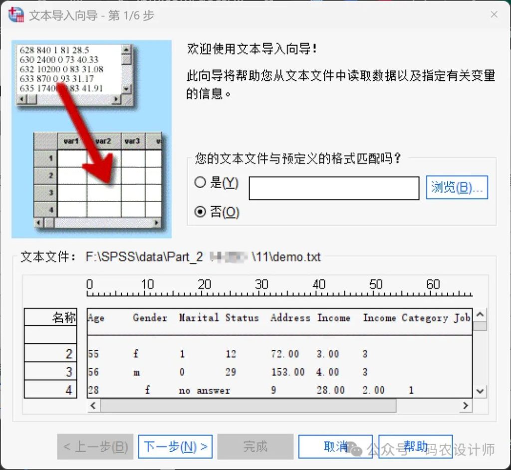 点击打开,SPSS会启动文本导入向导,用于定义读取数据文件的方式。