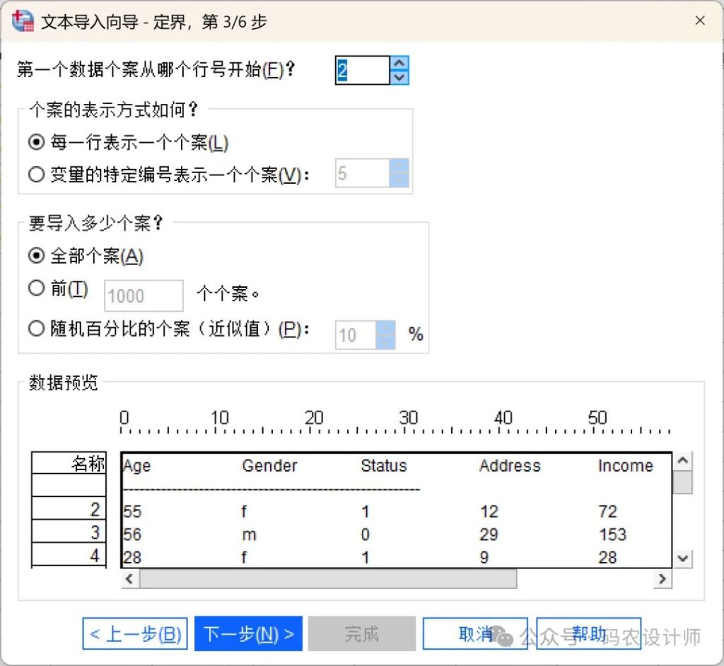 要导入多少个案选择导入数据文件中的所有个案、前n个个案,或指定百分比的随机样本。由于随机抽样会对每个个案做出独立的伪随机决定,因此所选个案的百分比只能近似于指定的百分比。数据文件中的个案越多,所选个案的百分比就越接近指定的百分比。
