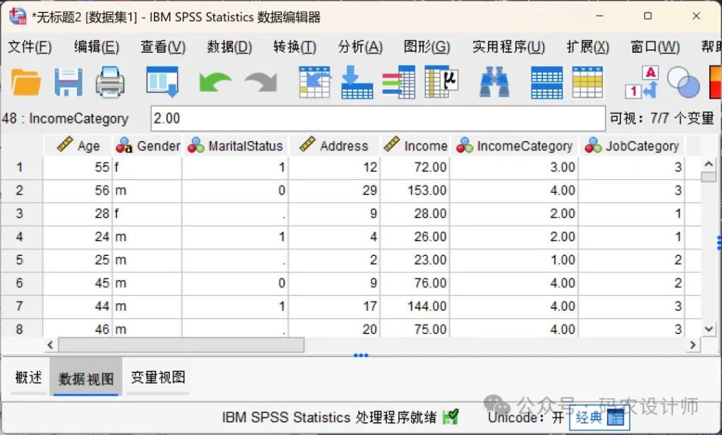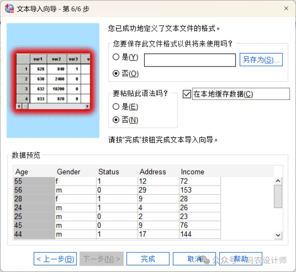 点击完成,SPSS会根据导入向导的设置将文本文件读入数据编辑器。