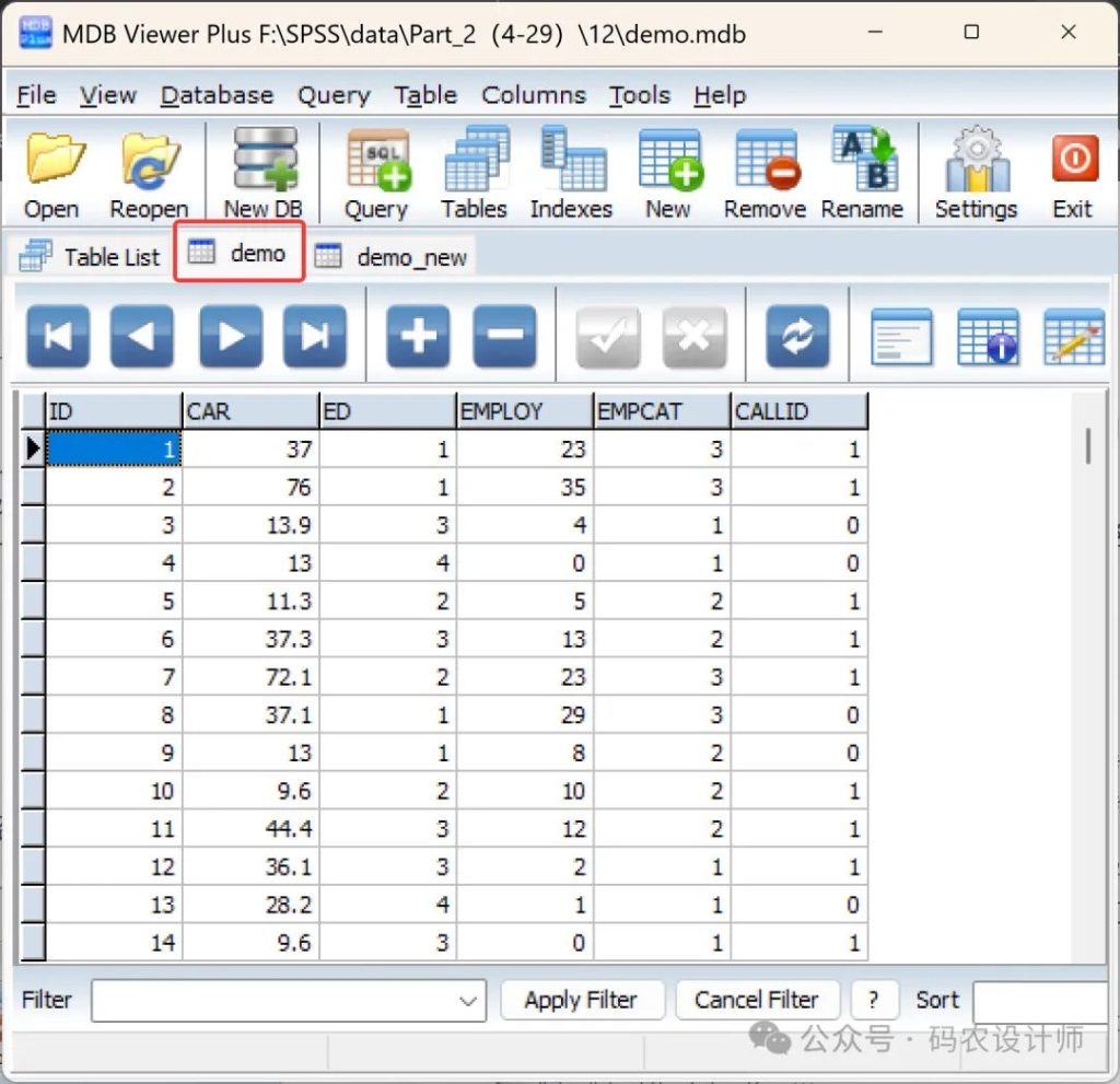 使用相应工具(如MDB Viewer Plus、MDBopener.com在线工具等)打开本次示例数据【demo.mdb】。可以看到数据库文件中包含「demo」和「demo_new」两个表,二者均有「ID」字段。后续数据读取时,将以该「ID」字段作为连接键,将两个表中的数据进行关联。
