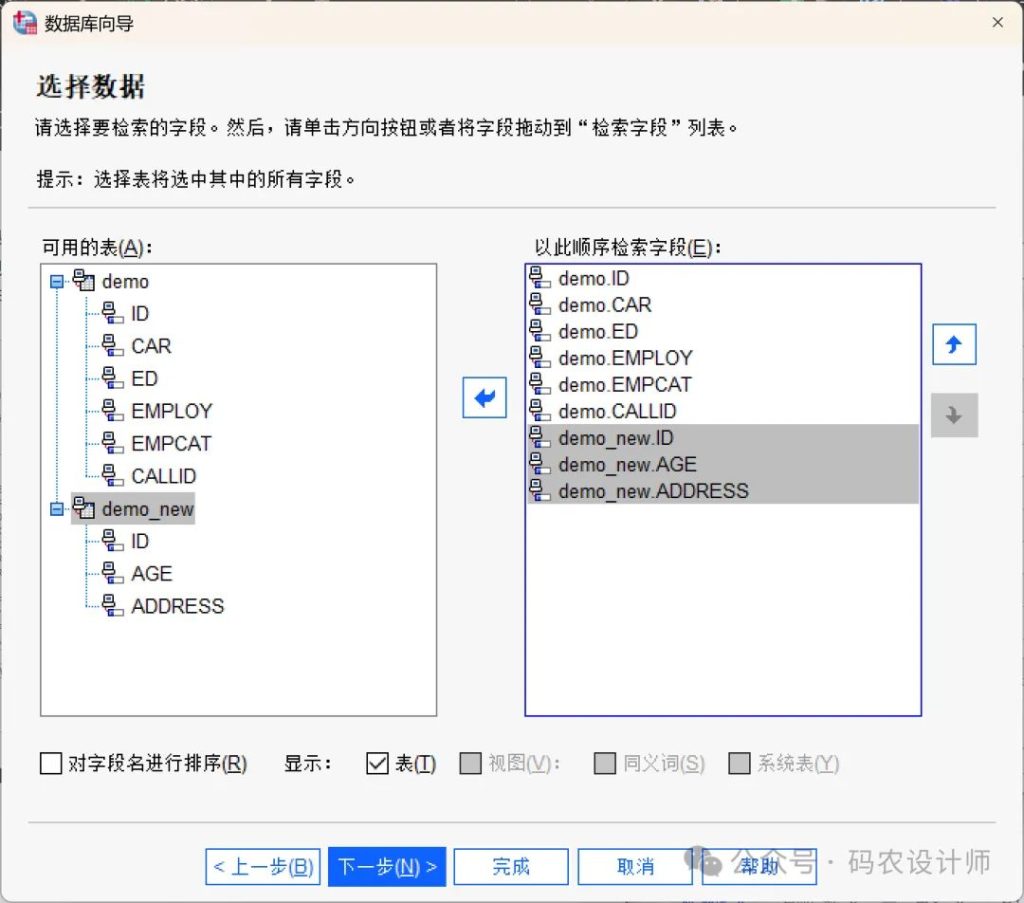 • 对字段名称进行排序:如果选中「对字段名进行排序」复选框,「数据库向导」将以字母顺序显示可用字段。