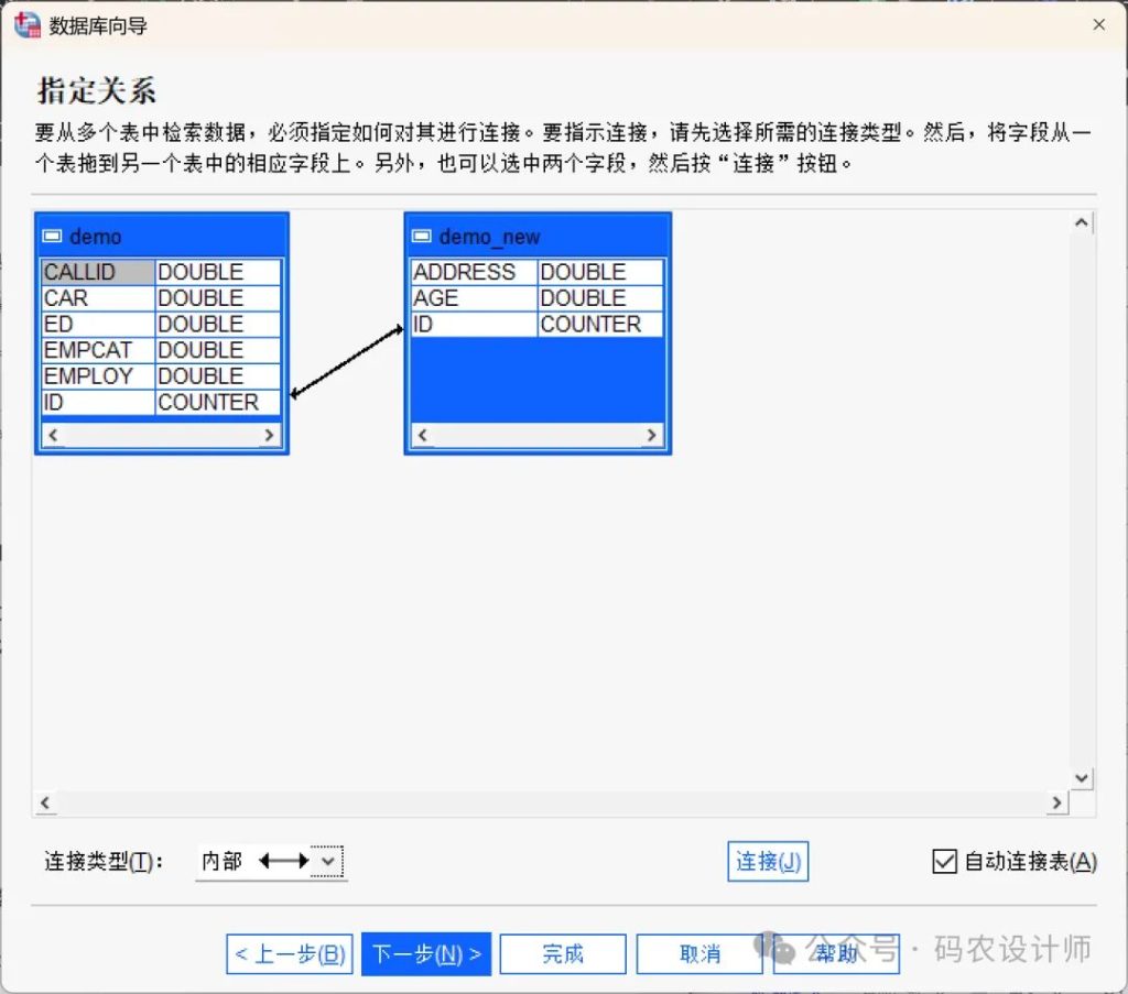 • 自动连接表:根据主键/外键或匹配的字段名和数据类型,尝试自动连接表。