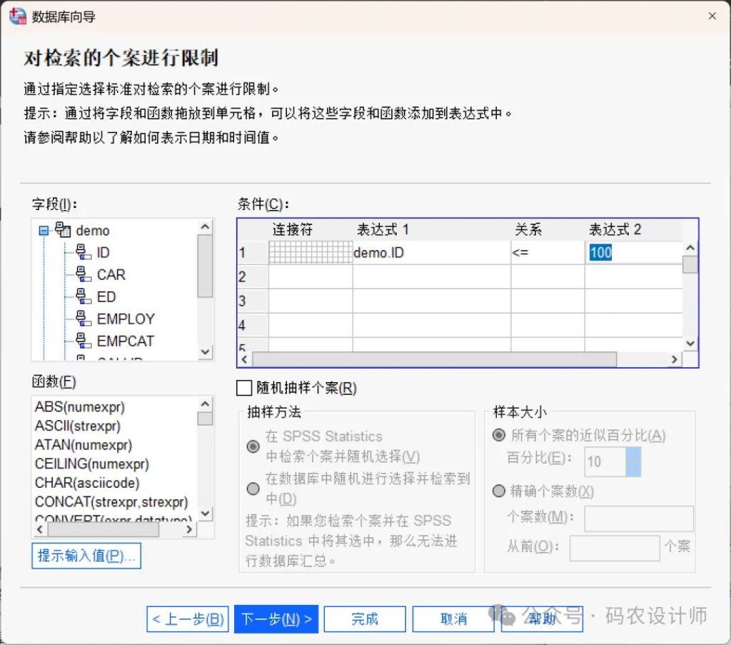 在本次示例中,通过设置表达式仅导入前100个个案。