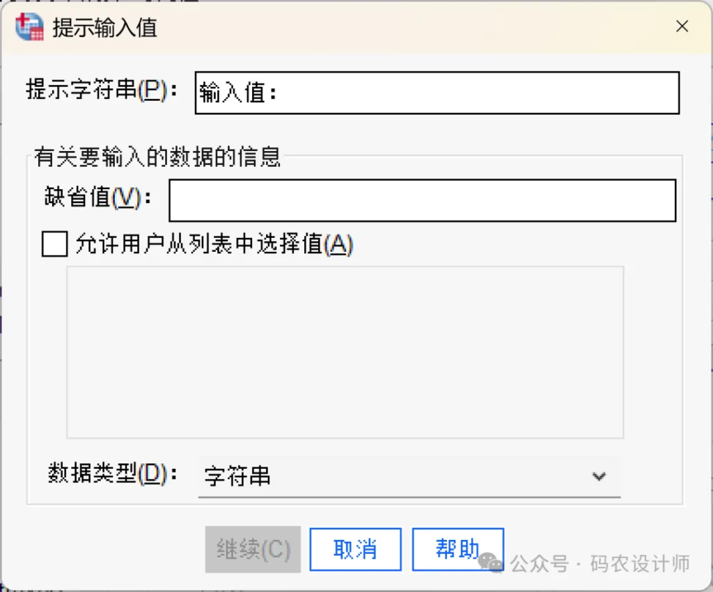 如果勾选「允许用户从列表中选择值」复选框,可以将用户的选择限制在提供的值范围内,各值之间以换行符分隔。如果数据类型为日期时,日期和时间值必须以特定格式输入。其中,日期值必须使用通用形式「yyyy-mm-dd」;时间值必须使用通用形式「hh:mm:ss」;日期/时间值(时间戳)必须使用通用形式「yyyy-mm-dd hh:mm:ss」。