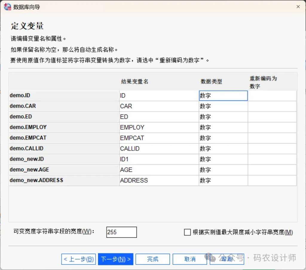 在定义变量阶段,字段名会自动被用作变量名。如果字段名不符合SPSS变量命名规则,SPSS会自动转换成合法的变量名,原始字段名则会保留为变量标签。