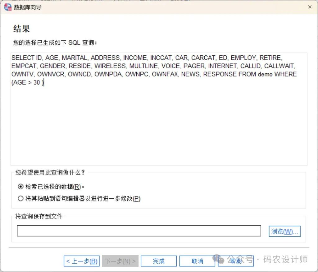 在最后一步,数据库向导会显示基于向导选择自动生成的SQL语句,可以选择立即执行SQL或者保存SQL到文件以后重用。