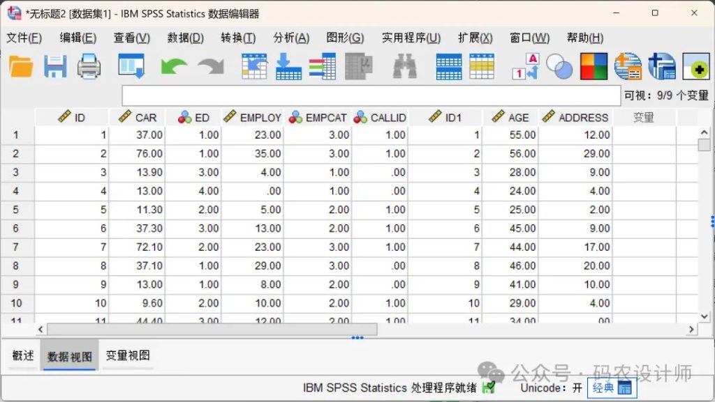 点击完成,SPSS会根据导入向导的设置将数据库文件读入数据编辑器。