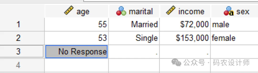• 系统缺失值:由程序自动标识的缺失情况例如,当数值型字段为空、数据类型验证失败或计算表达式未定义时,系统会将其自动标记为缺失。在数据编辑器中,此类值通常显示为一个点(.)。系统缺失值不会参与后续的统计分析。